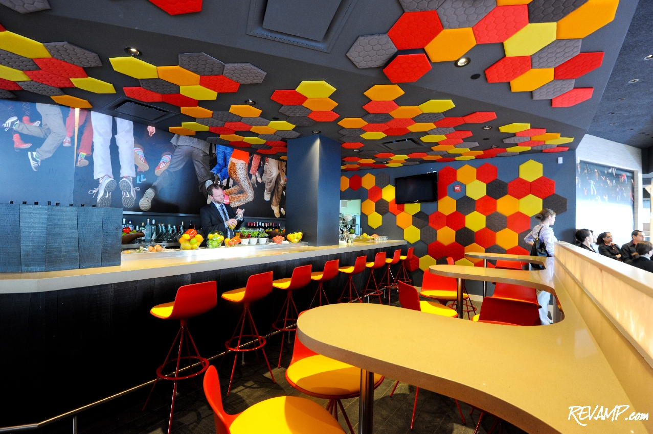When guests first enter the ‘new’ Penn Quarter Jaleo (the dining room seats 140, with 30 seats at the bar and 24 on the patio), they are immediately greeted by a bold host stand that was designed by Luis Eslava, as a giant flowerpot of sorts, complete with a unique red lamp installation.